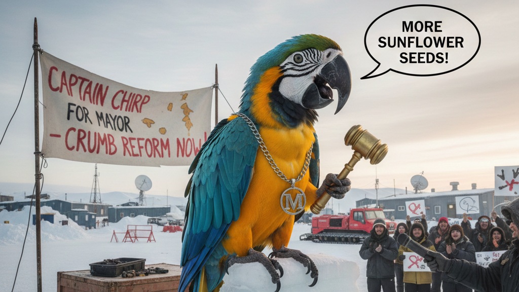 MCMURDO STATION, ANTARCTICA — In a shocking development that has political analysts scratching their heads and ornithologists demanding a recount, a blue-and-gold macaw named "Captain Chirp" has been declared the official Mayor-Elect of McMurdo Station, the largest community and research hub in Antarctica. The surprise victory came after Captain Chirp, the 14-year-old pet of eccentric tech billionaire and occasional polar researcher, Thaddeus P. Whistlewick, dominated the municipal election via an unprecedented wave of write-in votes.